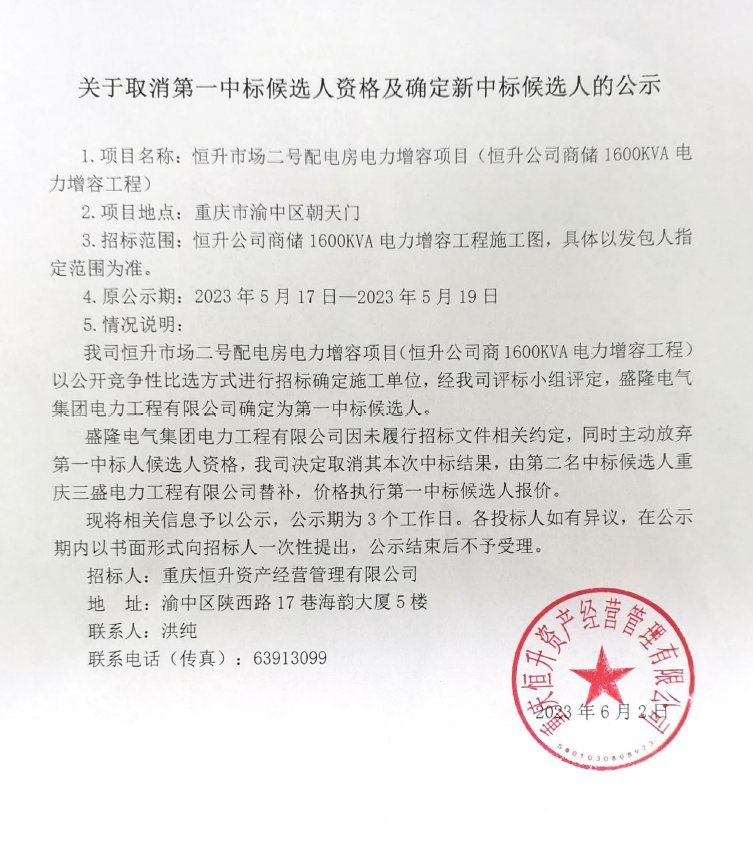 结果公示:关于取消第一中标候选人资格及确定新中标候选人的公示