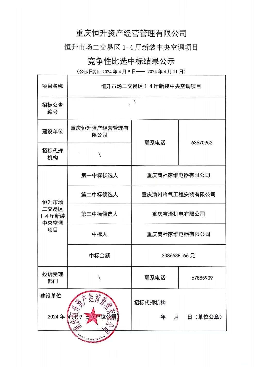 结果公示:重庆恒升资产经营管理有限公司 恒升市场二交易区1-4厅新装中央空调项目竞争性比选中标结果公示